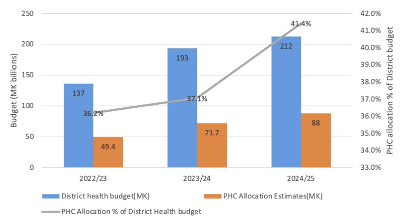 L’analyse budgétaire 2024/25 montre que l’allocation budgétaire pour les soins de santé primaires (SSP)[1] est passée de 36,2% en 2022/23 à 41,4% en 2024/25 en pourcentage du budget du district (Figure 3). L’allocation est alignée sur la réalité de la charge de morbidité au Malawi et les principaux déterminants de la santé sont largement influencés par la performance de son système de soins de santé primaires[2],[3].