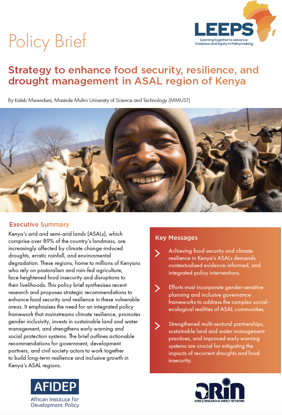 Kenya’s arid and semi-arid lands (ASALs), which comprise over 89% of the country’s landmass, are increasingly affected by climate change-induced droughts, erratic rainfall, and environmental degradation. These regions, home to millions of Kenyans who rely on pastoralism and rain-fed agriculture, face heightened food insecurity and disruptions to their livelihoods. This policy brief synthesises recent research and proposes strategic recommendations to enhance food security and resilience in these vulnerable areas. It emphasises the need for an integrated policy framework that mainstreams climate resilience, promotes gender inclusivity, invests in sustainable land and water management, and strengthens early warning and social protection systems. The brief outlines actionable recommendations for government, development partners, and civil society actors to work together to build long-term resilience and inclusive growth in Kenya’s ASAL region. Read more:
